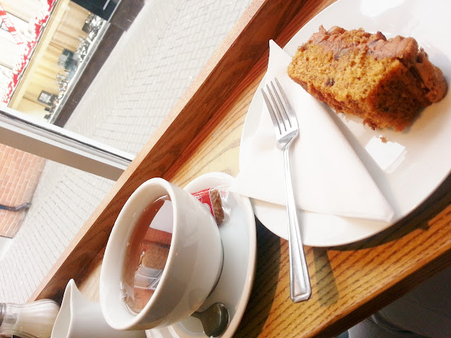 Today i made a quick dash to town after the school drop to run a few errands,I needed to sort out my bus pass and get new trousers for work among others. Although i had just under 2hours to do all that, i still managed to slip in a little bite, yum yum was this toffee cake and cup of tea. So yum i bit my tongue .Want some?