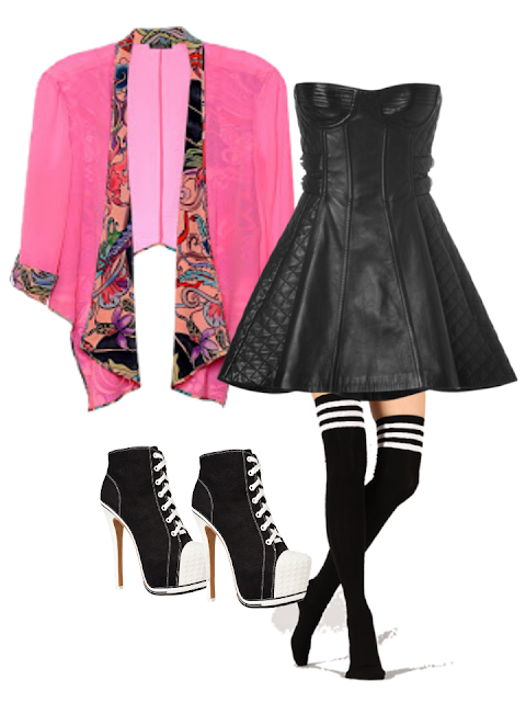 ![]() Poncho heels purse ![]() Parallel Division Thigh High Socks, BALMAIN Leather Bustier Dress in Black ,Zigi Shoes The Salute Shoe in Black and White , |