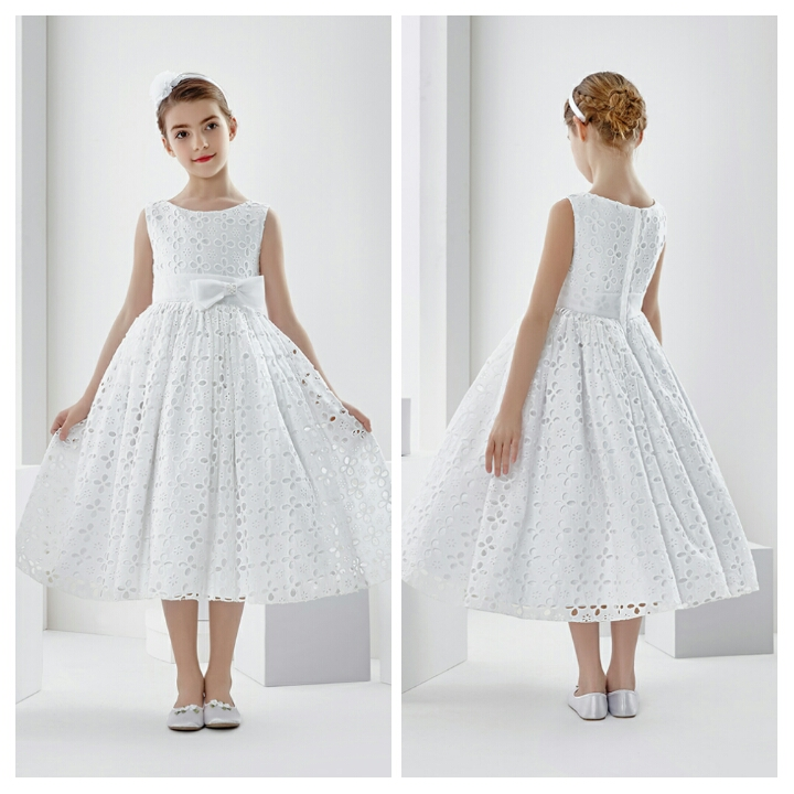 Sleeveless Bateau Neck Tea Length Lace First Communion Dress with Bow