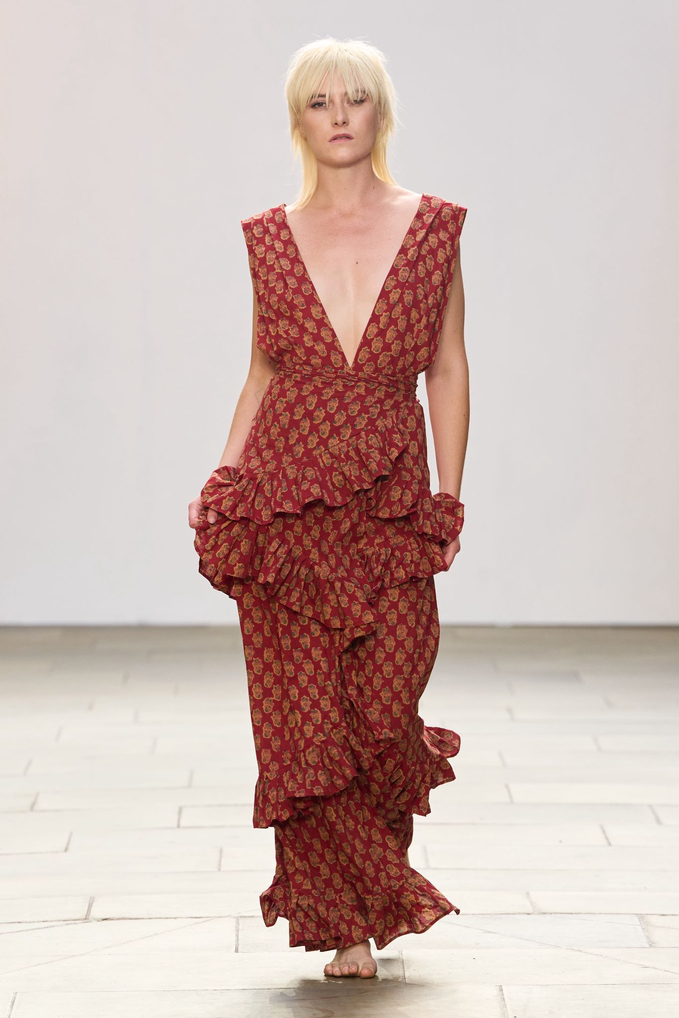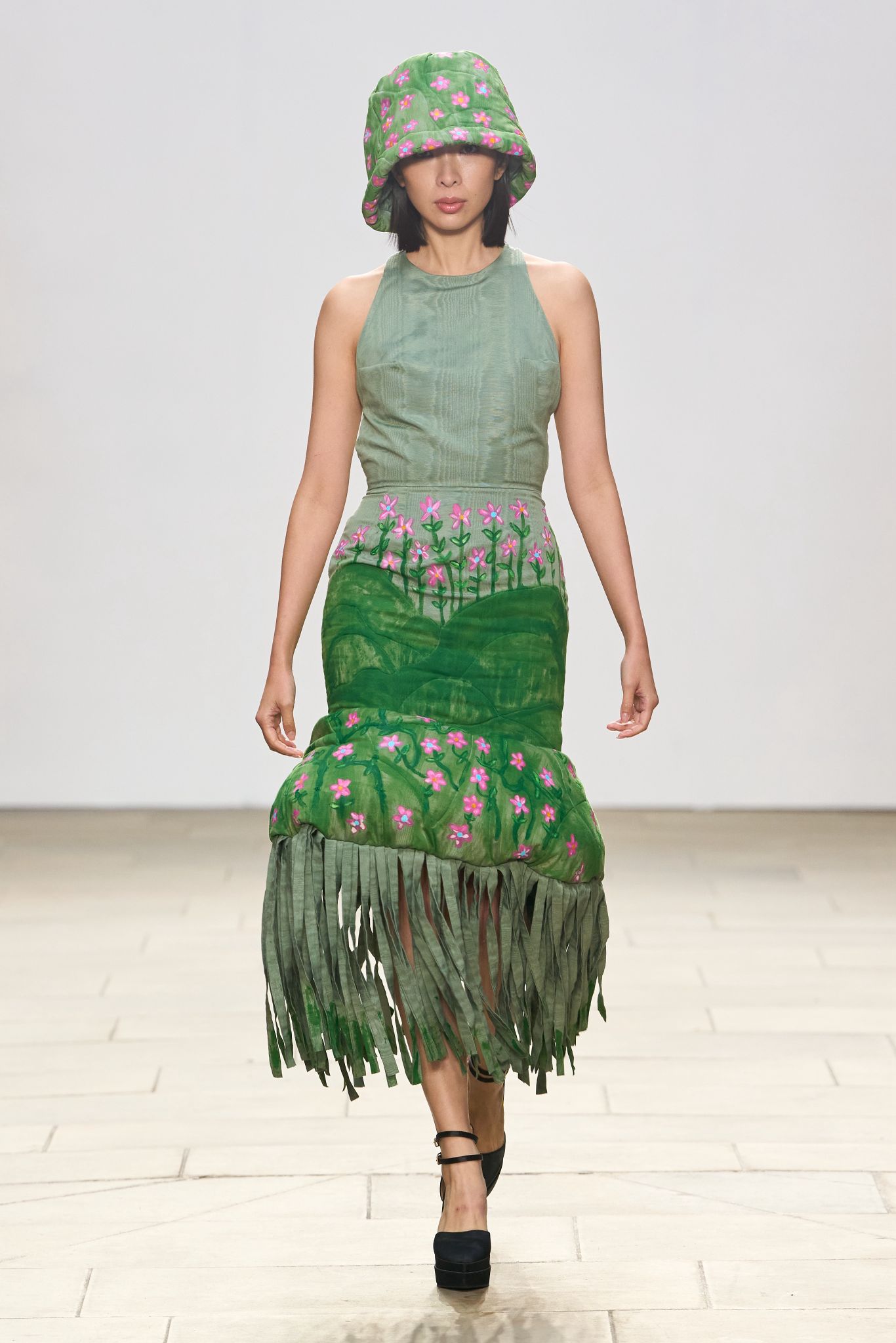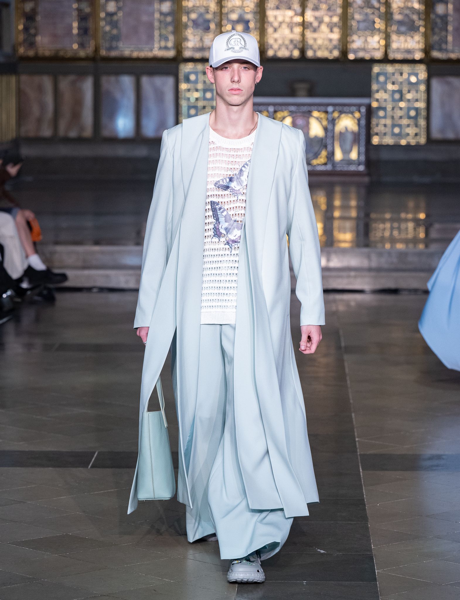 APUJAN’s SS26 collection, unveiled at 8 Northumberland Avenue under the theme The Extraordinary Voyage of Captain Peach, transformed the runway into a lyrical narrative that fused fantasy, folklore, and social commentary. Drawing inspiration from the Japanese tale of Momotaro, the show unfolded as a metaphorical journey through modern existence, rendered in 33 exquisitely crafted looks spanning both menswear and womenswear. Hallmarks of the house – ethereal printed chiffons, feather-light knits, intricate bespoke jacquards, sculptural formalwear, and technical sportswear were reimagined with cinematic flair, seamlessly bridging East and West, tradition and futurism. With each jacquard fabric developed in close collaboration with textile mills, APUJAN once again affirmed its mastery of storytelling through innovation, weaving literature and design into a singularly poetic vision.