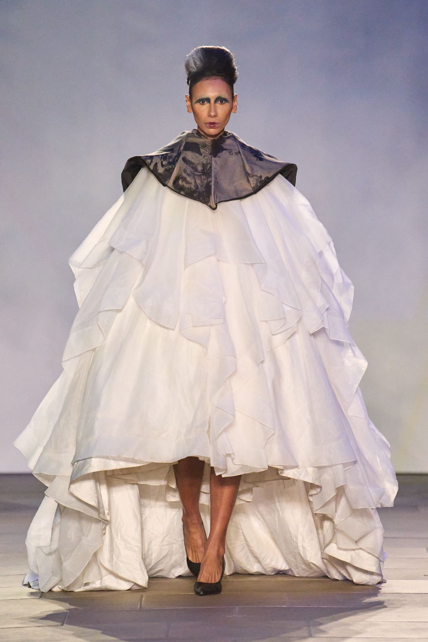In keeping with her signature avant-garde artistry, Hellavagirl brought to the runway, extravagant unconventional couture theatricality, and closed the show with a commanding presence.