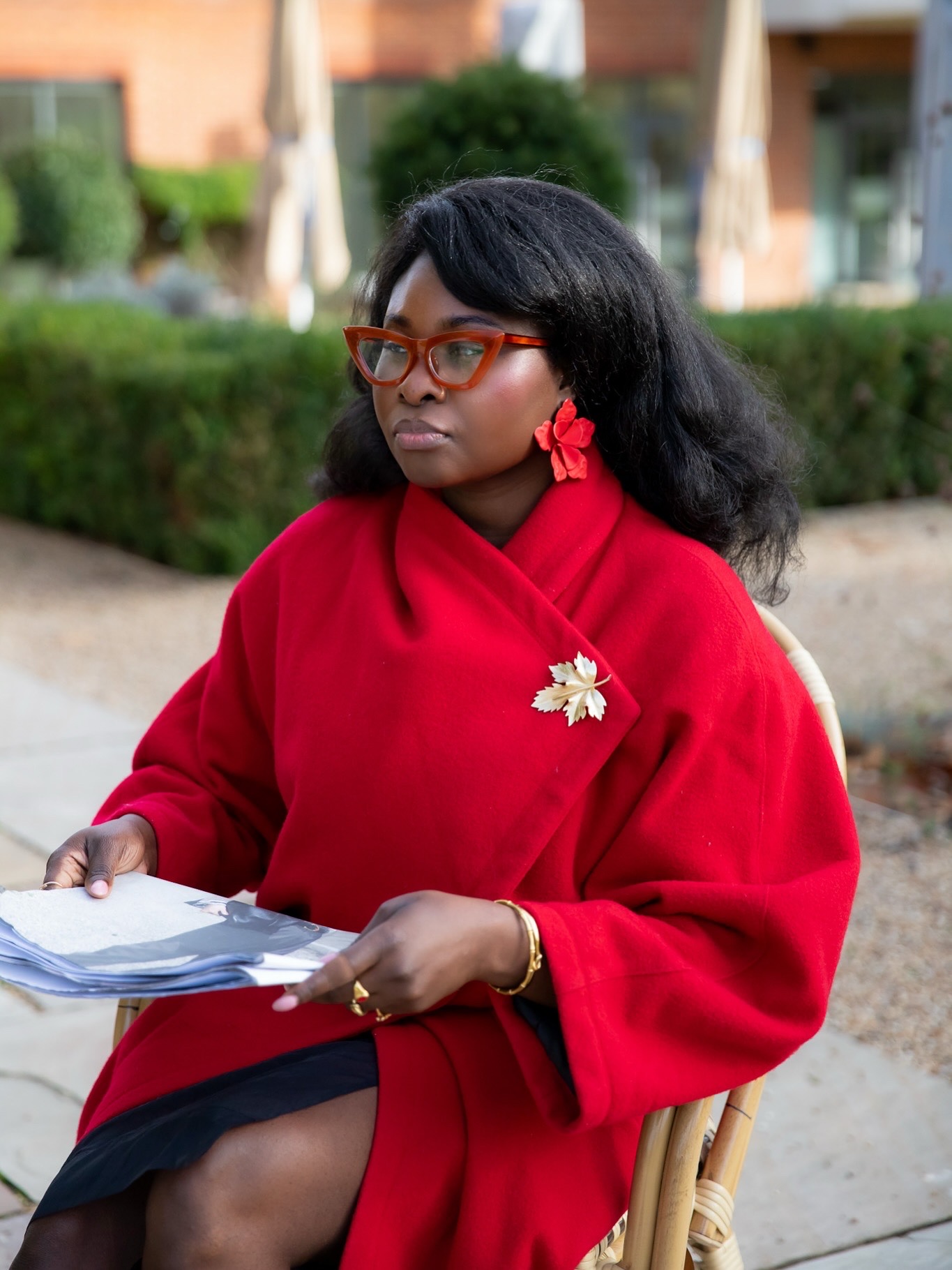 This outfit was inspired by the 1950s and early 1960s Old Hollywood. Cat-eye glasses introduce a bold vintage touch, and the structured red wrap coat reflects the dramatic outerwear of the era.