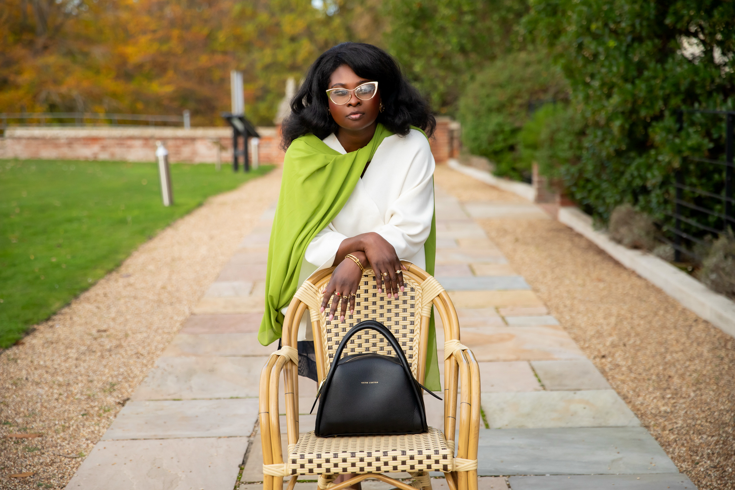 A soft pop of colour comes from the lime green scarf, which prevents the outfit from feeling too stark. It is simple, polished, and quietly elegant.