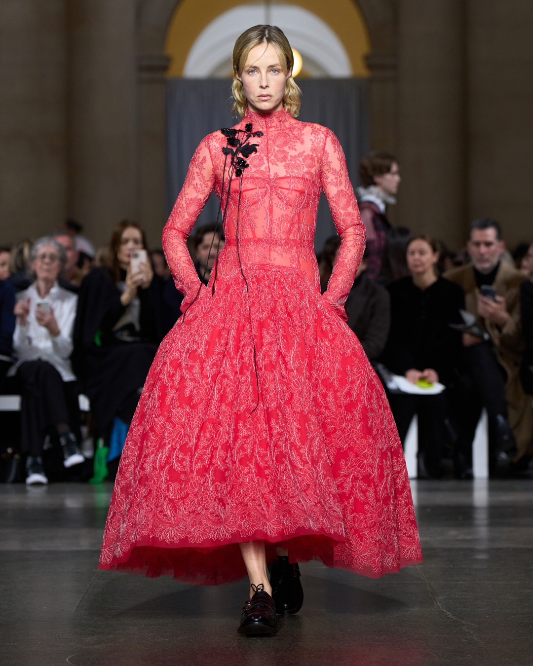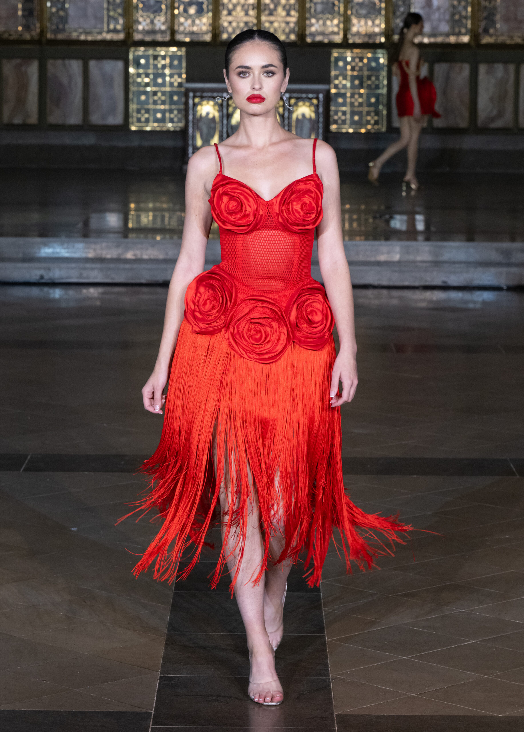 As the title suggests, the collection spoke of growth, structure and becoming. For London, two couture looks were revealed as a focused statement: The Orchid Dress and The Rose Dress. Each design embodied the house philosophy of strength and softness existing in harmony. One look featured a striking red sculptural mini dress with bold, architectural volume and organic detailing, while the other embraced rich texture and dramatic movement through floral appliqué and cascading fringe. Together, they formed a confident expression of femininity, rooted in heritage yet undeniably contemporary.