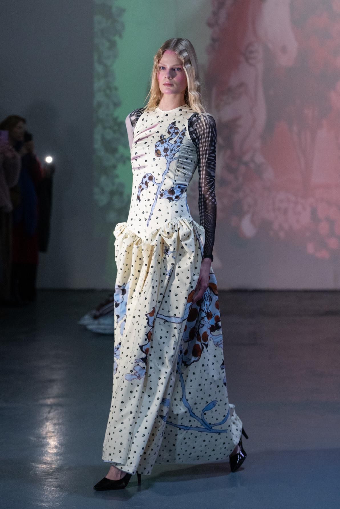 Claudia Wang’s A/W26 presentation at London Fashion Week unfolded like a digital fairytale, a delicate yet confident exploration of unbridled femininity. Before the first model stepped onto the runway, the space was already alive with imagination, screens glowing with unicorn illustrations that set a dreamlike tone. The set itself felt immersive and intimate, with plush mounds of pillows scattered across the floor, their covers crafted from the very prints seen in the collection – a soft, fresh colour palette.